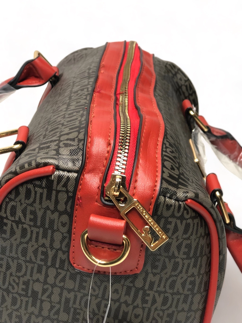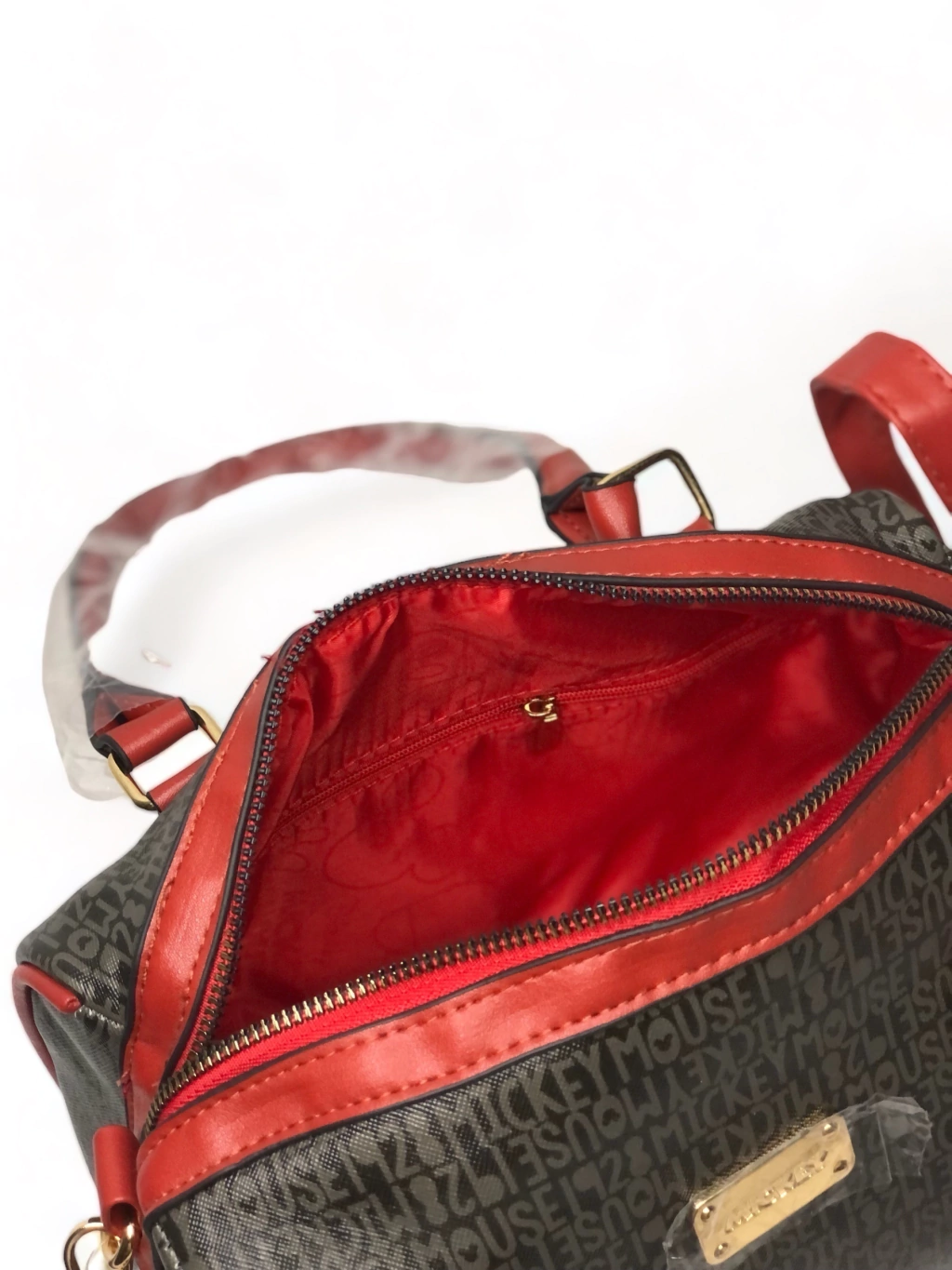 Num tom de marrom com a estampa formada pelo nome Mickey Mouse 1928 e um Mickey impresso na bolsa e
